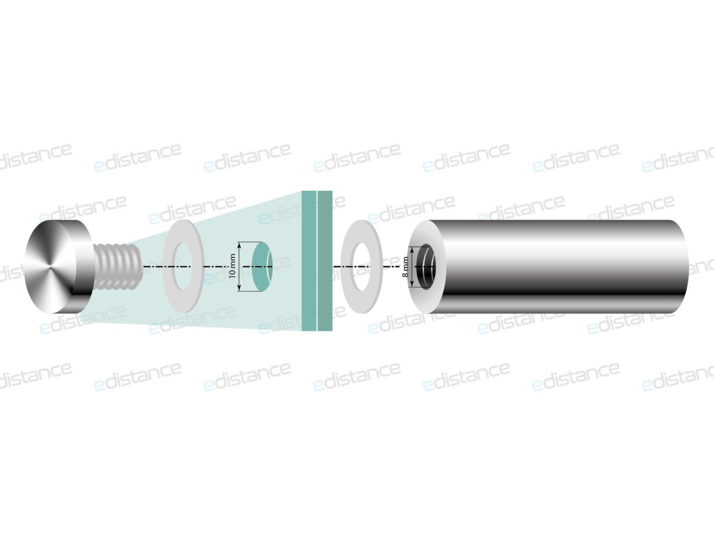 Distanční šroub ø 19 mm z nerezavějící oceli estetického vzhledu se snadnou montáží i demontáží. Odsazení tabulek od podkladu je 75 mm.